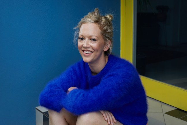 Image: a white woman in a blue jumper sitting on steps with her arms around her knees, smiling — image credit the fantastic Catherine Black.